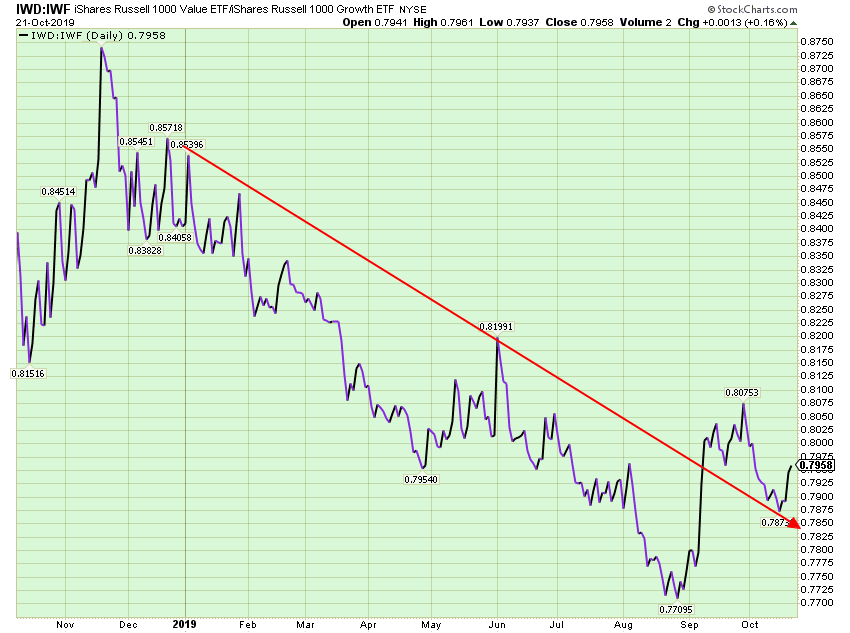 This supports a pivot in the Value/Growth ratio. The successful test of September's reversal came last last week. The downtrend in this ratio created by the now-aborted monetary tightening of 2017-18, seems to be broken.